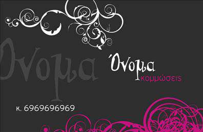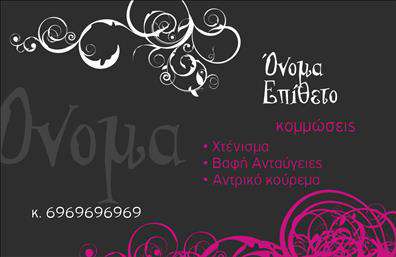 Κάντε εντυπωσιακή είσοδο στο χώρο των κομμωτικών με μοναδικές επαγγελματικές κάρτες! Επιλέξτε ανάμεσα σε μια ποικιλία σχεδίων και στυλ για να δημιουργήσετε τη δική σας εξατομικευμένη κάρτα. Εκτυπώστε τις πληροφορίες επικοινωνίας σας σε ποιοτικό χαρτί με λαμπερά χρώματα και εντυπωσιάστε τους πελάτες σας με το επαγγελματικό σας image!