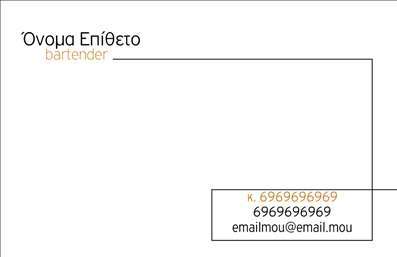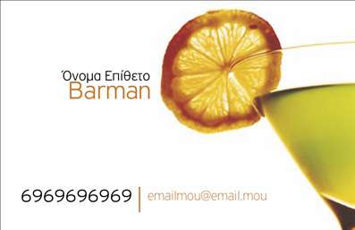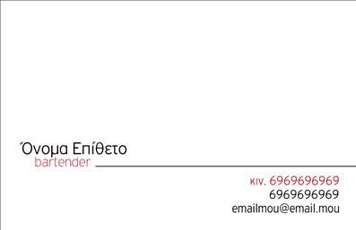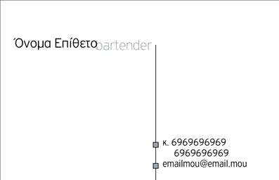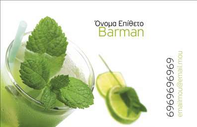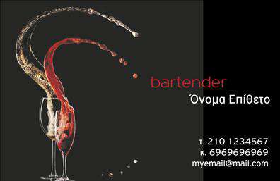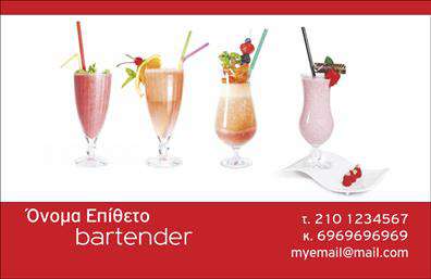 Είστε bartender και θέλετε επαγγελματικές κάρτες που θα αντικατοπτρίζουν την επαγγελματική σας προσωπικότητα και θα σας διαφοροποιούν από τους υπόλοιπους; Στην όραση γραφικές τέχνες μπορούμε να σας προσφέρουμε εξατομικευμένες επαγγελματικές κάρτες που θα ικανοποιήσουν τις ανάγκες σας και θα ανταποκριθούν στις προσδοκίες σας. Επιλέξτε το σχέδιο που σας ταιριάζει και επικοινωνήστε μαζί μας για να δημιουργήσουμε μαζί τις επαγγελματικές σας κάρτες.