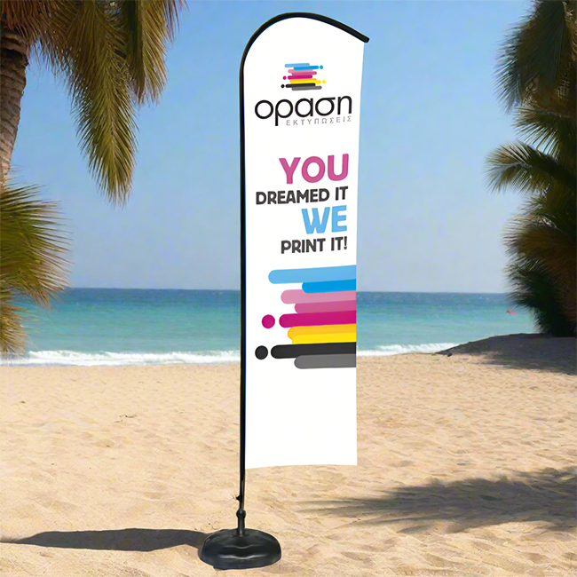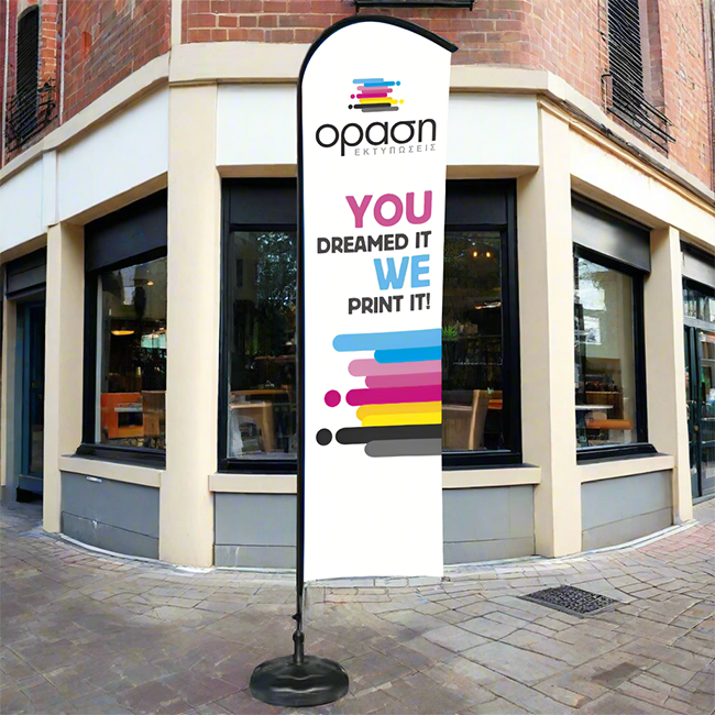 Το Eco Flying Banner ύψους 4 μέτρων με εκτύπωση 75x270 cm προσφέρει μέγιστη ορατότητα και ιδανική παρουσία σε εξωτερικούς χώρους με έντονη κίνηση. Η στενή, καμπυλωτή σχεδίαση αναδεικνύει το μήνυμα χωρίς να καταλαμβάνει πολύ χώρο.