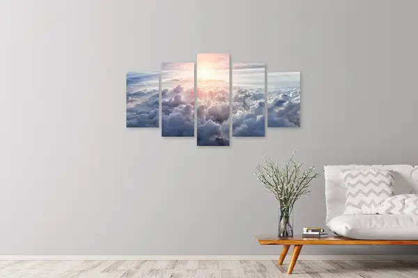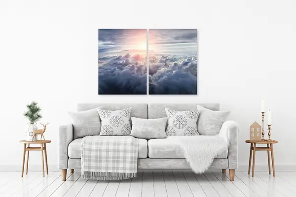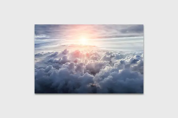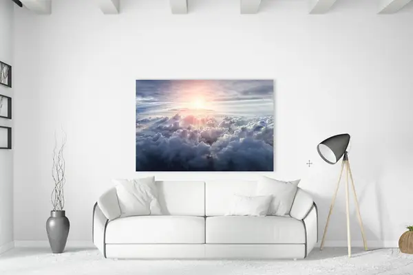 Ο πίνακας αποτυπώνει ένα ειδυλλιακό τοπίο, όπου τα σύννεφα και τα απαλόχρωμα στοιχεία της φύσης κυριαρχούν. Οι αποχρώσεις του λευκού και του γαλάζιου κυριαρχούν, δημιουργώντας μια αίσθηση απουσίας βαρύτητας και ελευθερίας. Οι λεπτομέρειες και οι πινελιές αποδίδουν με άριστο τρόπο την ηρεμία και τη γοητεία του φυσικού κόσμου. Η φωτογραφία αυτή μπορεί να προκαλεί απροσδόκητες σκέψεις για τη δύναμη της φύσης και τη σχέση μας μαζί της.