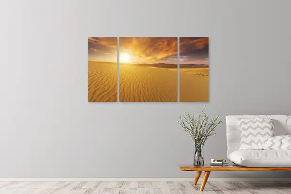 Ο πίνακας αποτυπώνει ένα εντυπωσιακό τοπίο ερήμου, όπου το φως και οι σκιές παίζουν ένα καθοριστικό ρόλο. Η χρωματική παλέτα του πίνακα, με τόνους του χρυσού και του καφέ, αναδεικνύει τις αμμόλοφους και τους προσδίδει μια σχεδόν κινηματογραφική αίσθηση. Η υφή του καμβά προσθέτει βάθος, ενώ οι λεπτές πινελιες συμβολίζουν την αέναη κίνηση της φύσης.