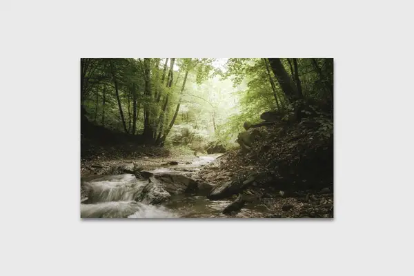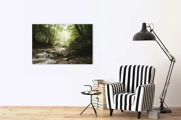 Αυτός ο πίνακας σε καμβά αποτελεί ένα εξαιρετικό παράδειγμα της φωτογραφικής τεχνικής που πιάνει τη μαγεία της φύσης. Με κυρίαρχα στοιχεία το νερό και την καταπράσινη βλάστηση, η χρήση φυσικών τόνων προκαλεί μια αίσθηση γαλήνης και ηρεμίας. Τα χρώματα των πινελιών είναι υποτονικά και ήρεμα, ενισχύοντας την γενική αρμονία του έργου και το προσφέρουν μια διαχρονική κομψότητα. Το θέμα του πίνακα παραπέμπει σε στιγμές βαθειάς συνδεσιμότητας με τη φύση και ασύλληπτου κάλλους. Η απαλότητα και οι διαβαθμίσεις του φωτός συμβολίζουν την ελπίδα και την αναγέννηση.