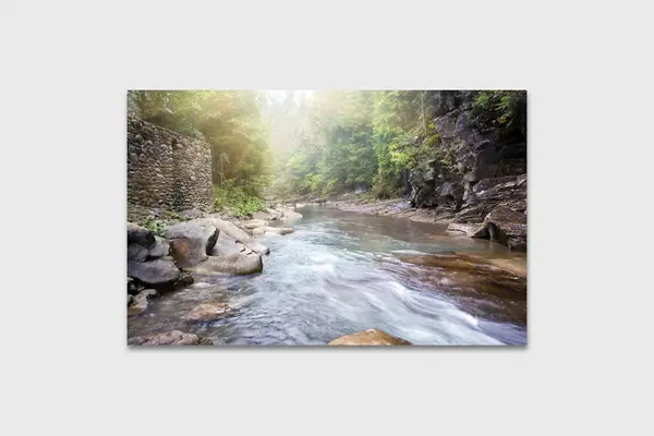 Ο RIV-054 είναι μια λεπτομερής απεικόνιση ενός φυσικού τοπίου, πλούσια σε στοιχεία που δίνουν ζωή και κίνηση στο σκηνικό. Τα χρώματα κυμαίνονται από βαθιούς πράσινους και μπλε τόνους έως γήινες αποχρώσεις, αναδεικνύοντας τις λεπτομέρειες του τοπίου και δημιουργώντας μια συναίσθηση γαλήνης και φυσικής ομορφιάς. Η εκτύπωση στον καμβά αναδεικνύει τις υφές και τις λεπτομέρειες της εικόνας με τρόπο που προσομοιάζει στη ζωγραφική. Η λεπτότητα με την οποία αποδίδονται οι μορφές και η διάταξη του φυσικού τοπίου δημιουργούν μια αρμονία που καθηλώνει το βλέμμα. Το θέμα του τοπίου εξετάζει την αδιάκοπη σχέση του ανθρώπου με τη φύση, ένα μοτίβο που απασχολεί την καλλιτεχνική δημιουργία καθ' όλη τη διάρκεια της ιστορίας.
