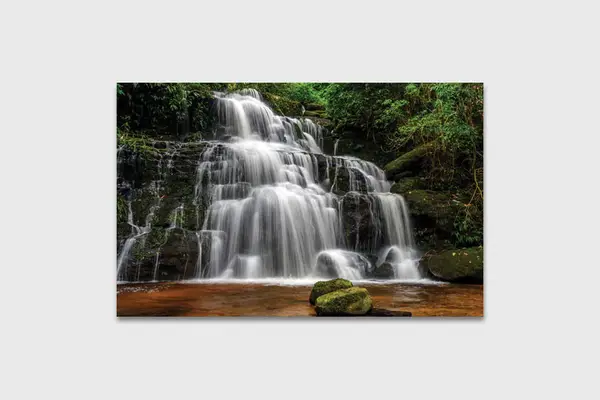 Το συγκεκριμένο έργο παρουσιάζει ένα μαγευτικό τοπίο με καταρράκτες, όπου το νερό πέφτει ανάμεσα από πυκνά πράσινα δέντρα, δημιουργώντας ένα φυσικό θέαμα που αναδεικνύεται από την ισχύ και την κίνηση του νερού. Η επιλογή χρωμάτων εμπνέει δροσιά και ανανέωση, με τόνους του μπλε και του πράσινου να κυριαρχούν, ενώ ο φωτισμός ενισχύει τη θεατρικότητα του τοπίου. Οι λεπτές πινελιές και η προσεκτική χρήση των υφών παρέχουν βάθος στην εικόνα και εντείνουν την αίσθηση της φυσικής ροής του νερού.
