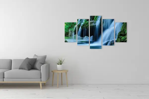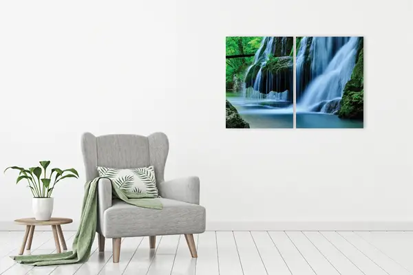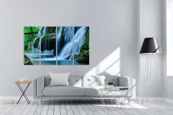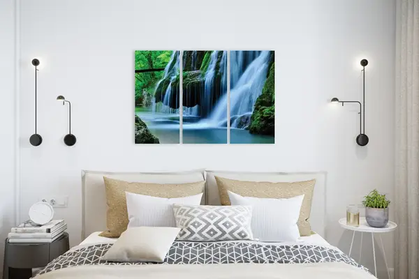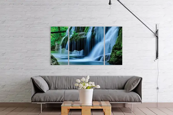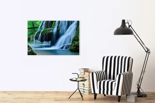 Ο συγκεκριμένος καμβάς, με τον κωδικό 82613, απεικονίζει έναν καταρράκτη που περιβάλλεται από πλούσιο πράσινο τοπίο. Τα χρώματα κυμαίνονται από δροσερά πράσινα μέχρι γαλήνια μπλε και λευκά, αντικατοπτρίζοντας τη φυσική ομορφιά και την ηρεμία που αποπνέει το τοπίο. Η απλή αλλά εκλεπτυσμένη χρήση του φωτός στο έργο υπογραμμίζει τη θετική ενέργεια, φέρνοντας έναν αέρα ανανέωσης και αρμονίας στον χώρο. Η σύνθεση δημιουργεί μια ροή που είναι κατευθυνόμενη από την καταρράχτηση του νερού, που προσθέτει δυναμικότητα και ζωντάνια.
