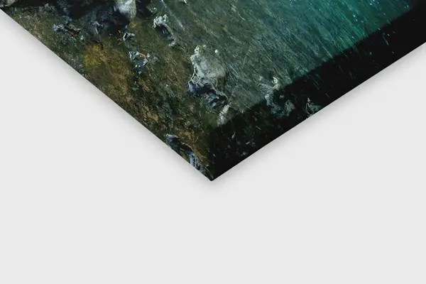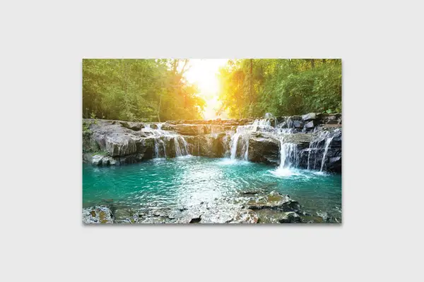 Ο πίνακας σε καμβά απεικονίζει έναν καταρράκτη, με προσεγμένες λεπτομέρειες που αναδεικνύουν την ομορφιά της φύσης. Η χρήση φωτεινών και ζωντανών χρωμάτων όπως το μπλε και το πράσινο δημιουργούν μια πλούσια αντιπαράθεση, ενώ οι πινελιές είναι απαλά διαμορφωμένες για να προσφέρουν κίνηση στο νερό που πέφτει. Η υφή του καμβά αναδεικνύει τις λεπτομέρειες της φύσης, δημιουργώντας έναν συνδυασμό ηρεμίας και δυναμικότητας. Η σύνθεση είναι τέλεια ισορροπημένη, με τα χρώματα και τις υφές να συνεργάζονται για να προσφέρουν μια αίσθηση φυσικής ομορφιάς.