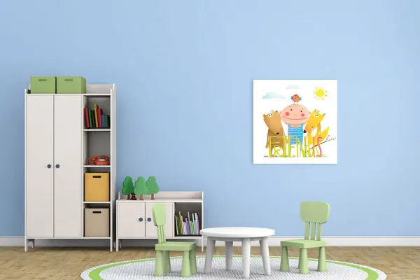 Η ψηφιακή εκτύπωση του συγκεκριμένου έργου, σε καμβά υψηλής ποιότητας, αποπνέει μια φινέτσα κατάλληλη για παιδικές θεματικές. Η χρήση των χρωμάτων σε απαλές αποχρώσεις, με καθαρές γραμμές και μαλακές υφές, δίνει μια αίσθηση καθαρότητας και αγνότητας. Το παιδικό θέμα είναι δοσμένο με έναν τρόπο που συλλαμβάνει την αθωότητα και τη φαντασία, δημιουργώντας έναν δυναμικό διάλογο με τους μικρούς θεατές. Η απλότητα των σχεδίων και η γλυκύτητα των αντανακλάσεων προσελκύουν την προσοχή και μεταφέρουν μια αίσθηση χαράς και ασφάλειας.